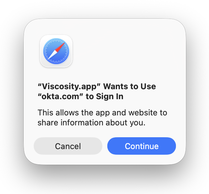 When using the "Open in Web Browser" method for authentication, macOS will prompt for permission to continue with the message "Viscosity.app" Wants to Use "example.com" to Sign In. The domain name in the message will be that of the website being used for authentication. This message comes from macOS, not Viscosity, and it will appear every time web authentication or re-authentication takes place when using the "Open in Web Browser" method.
