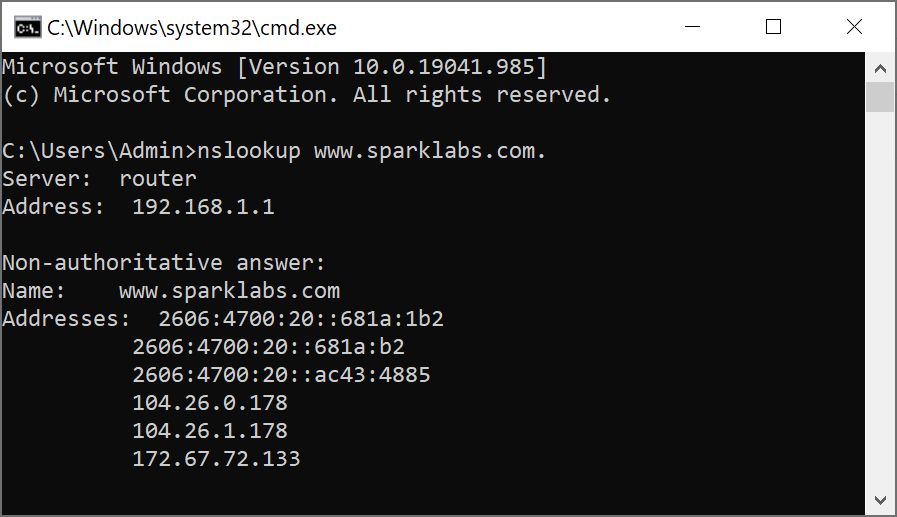 - Make a note of the IP address that is returned. It's possible that multiple IP addresses may be returned, indicating that multiple servers are being used. For example, the output in the screenshot above indicates that the server has multiple IP addresses, including both IPv4 and IPv6 addresses.