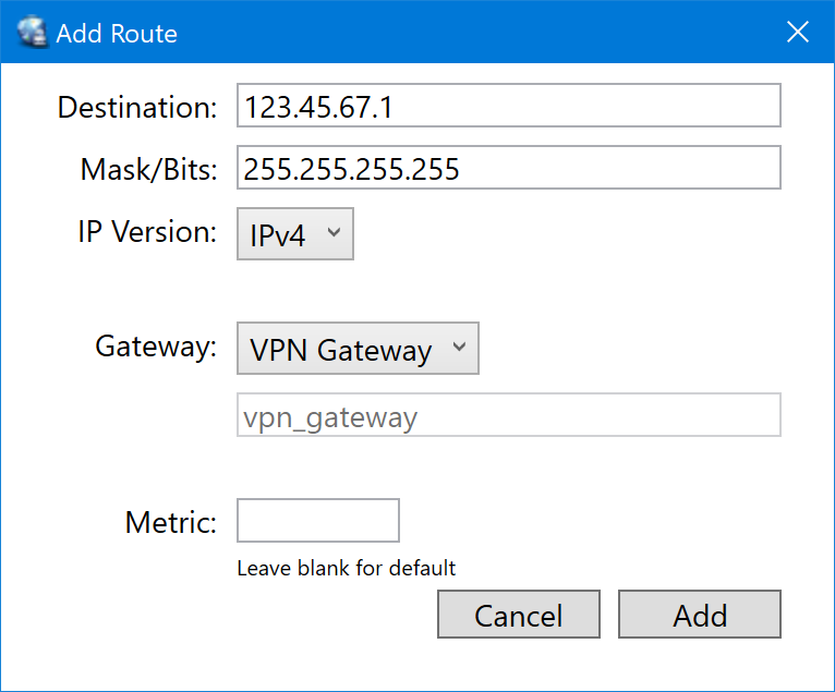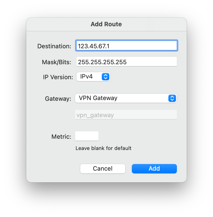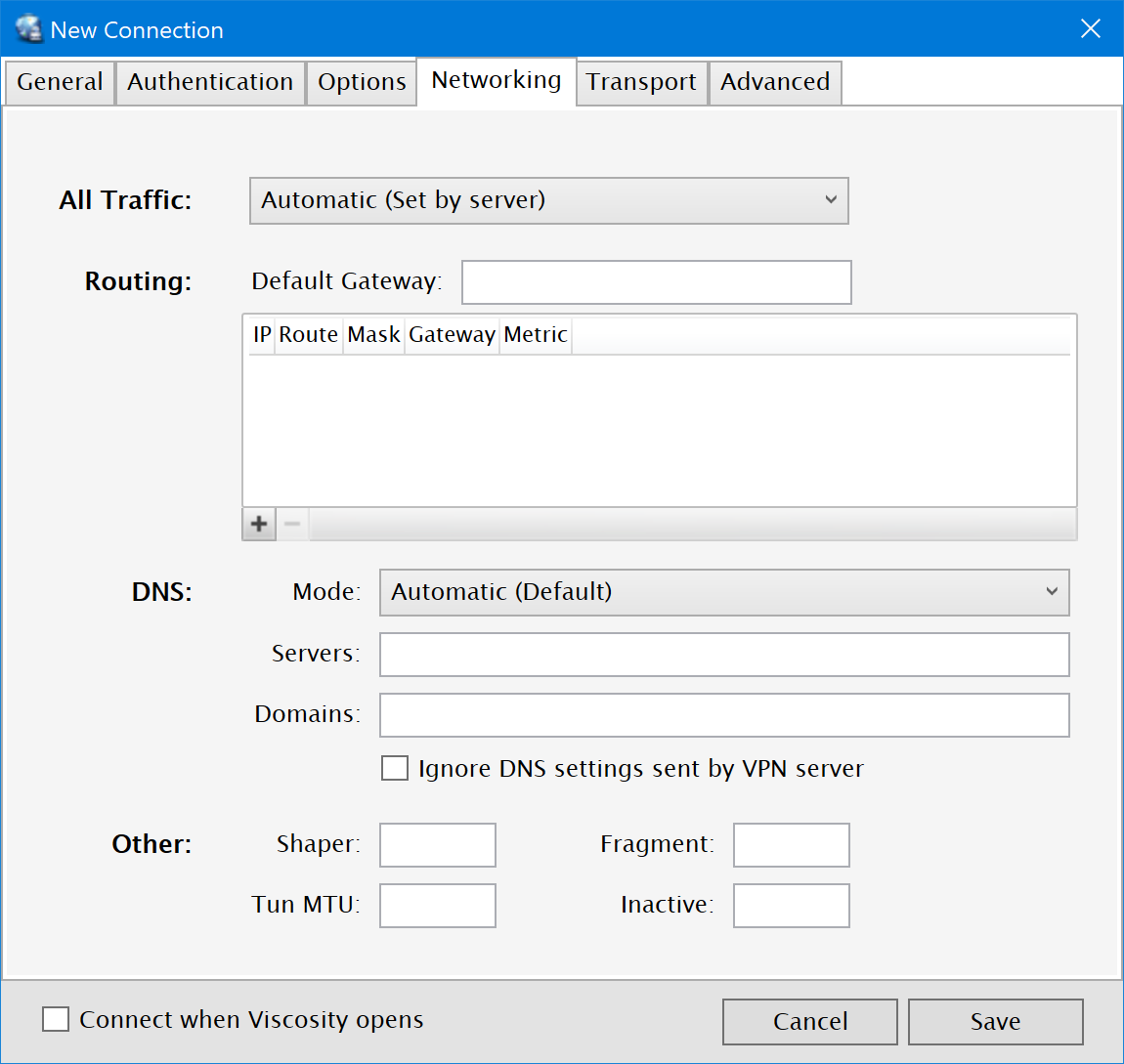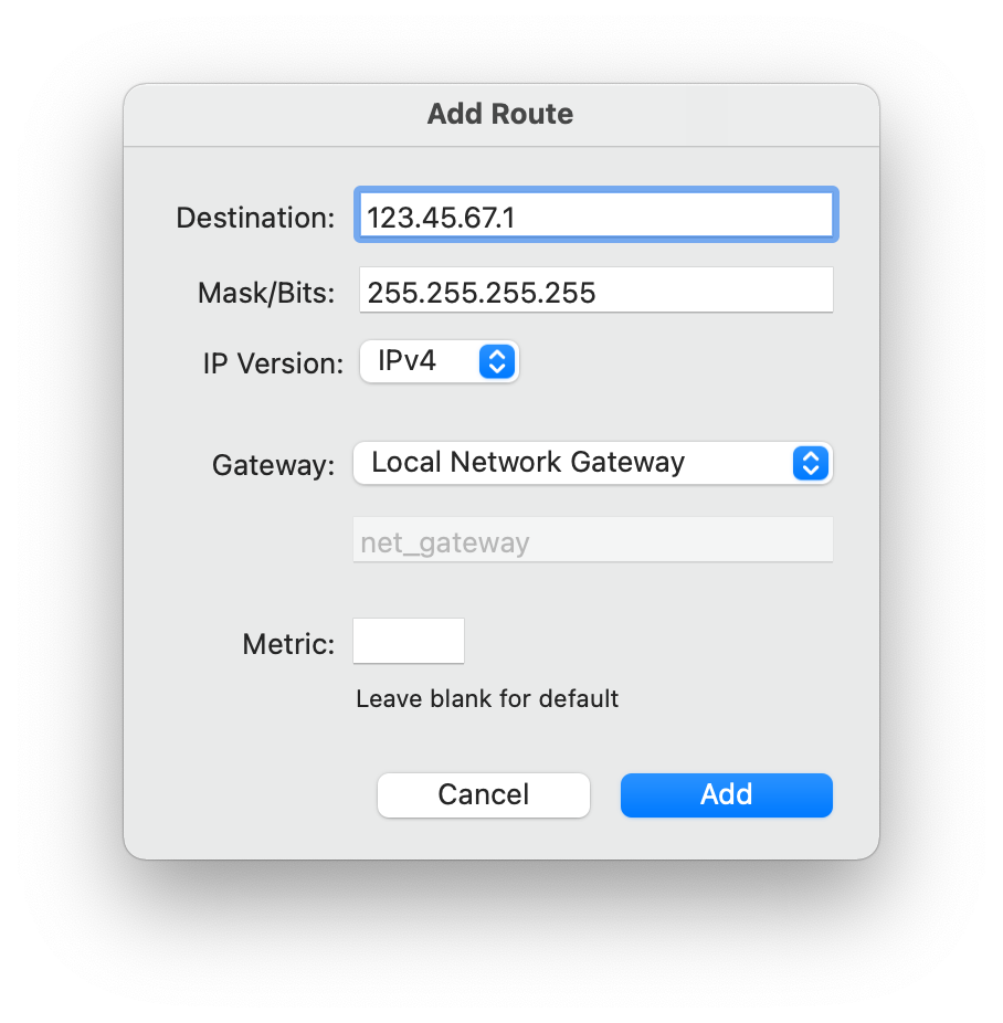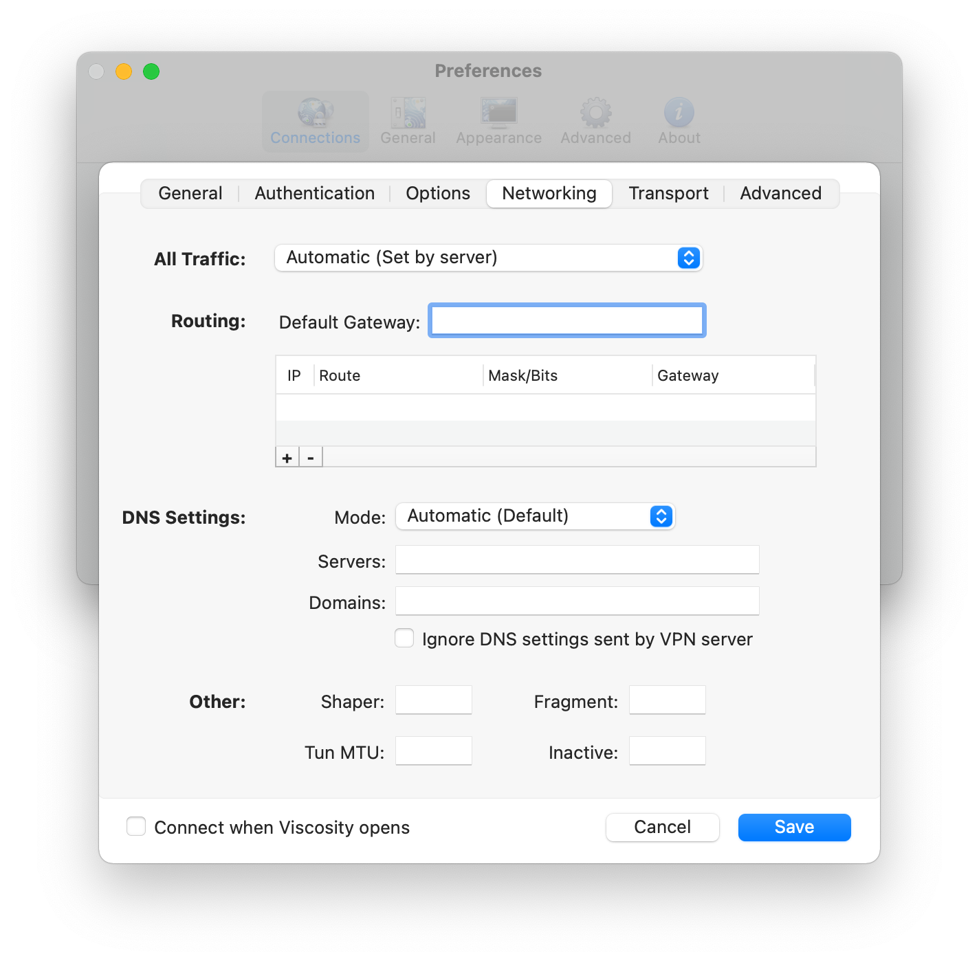 Viscosity can also create routes allowing you to specify traffic that should go through the computer's normal network connection instead of the VPN. Please be aware of the Netmask comments listed in the above section before adding a route.
