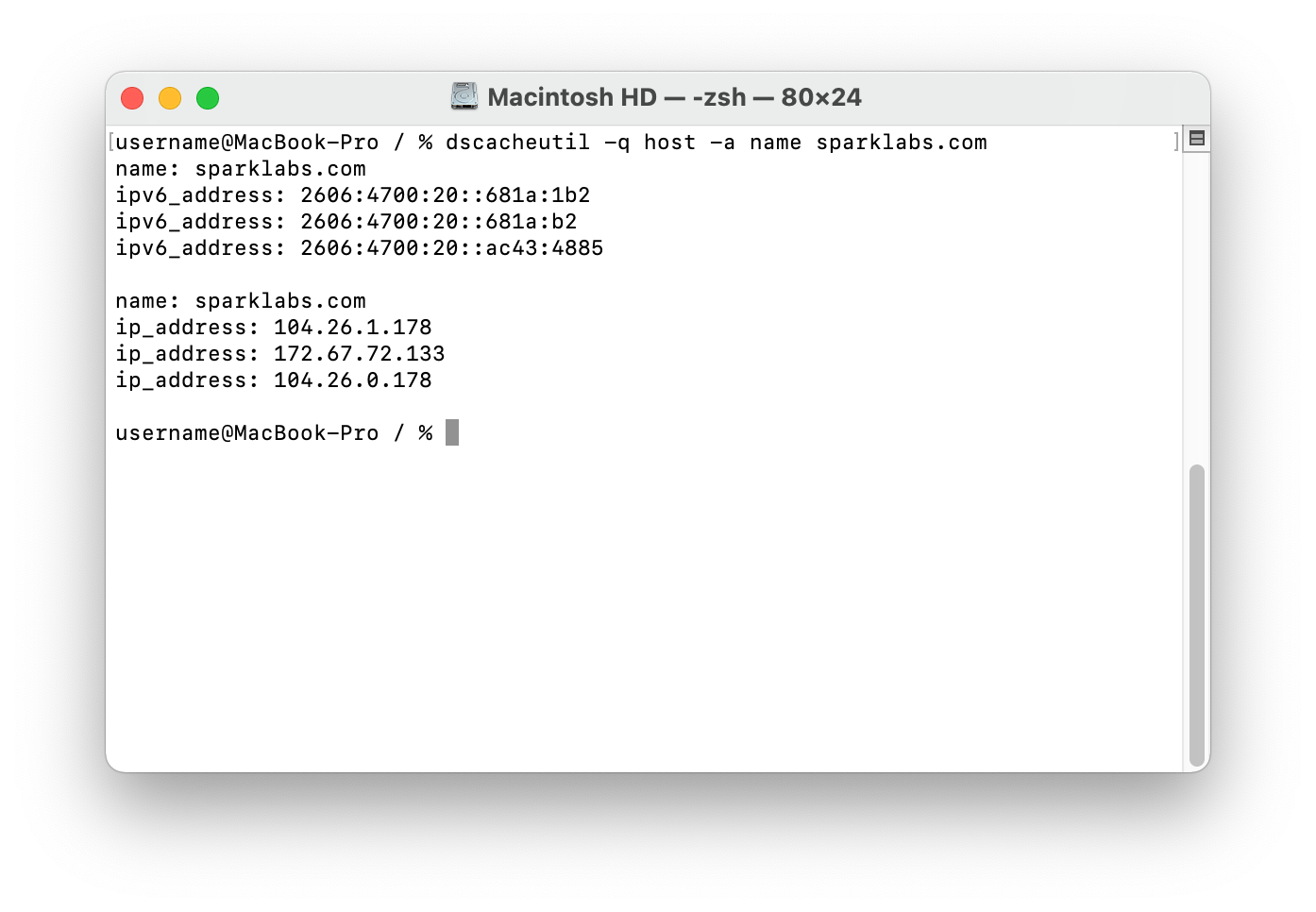 - Enter the following command into the window that appears, replacing "sparklabs.com" with the domain name you wish to look up. Press Return or Enter on your keyboard.