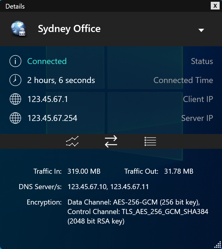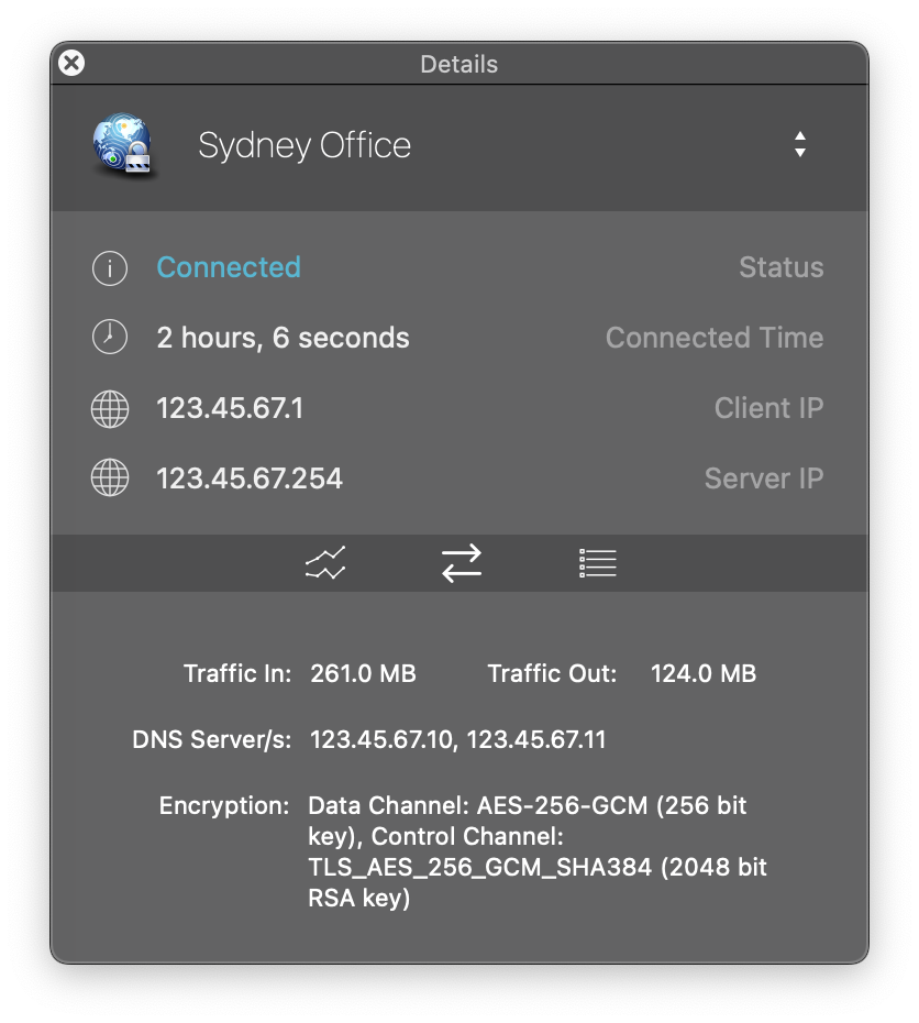 To view the DNS server/s being used via the Details window, first open the Details window from Viscosity's main menu, and then click the "Display Traffic" icon (the second icon from the left) to display additional traffic and VPN connection information. The DNS server/s set for the VPN connection will be listed.